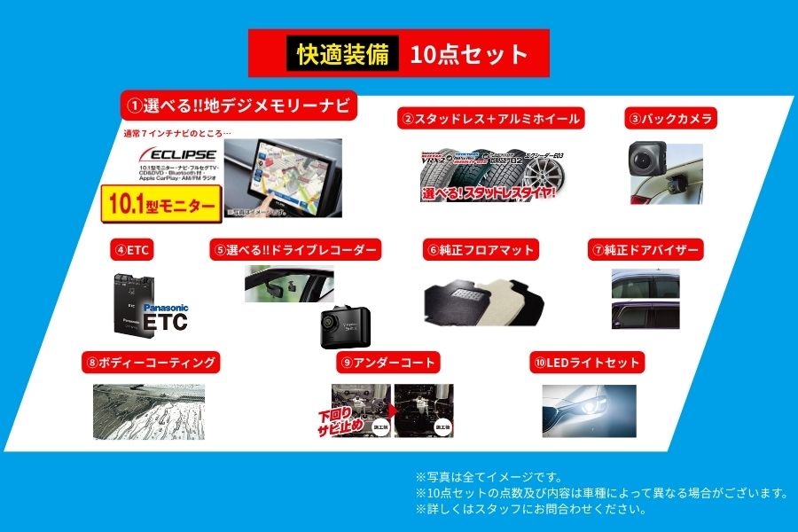 毎日のドライブを快適・安心に過ごすために必要な装備を、厳選10点セットにまとめました!