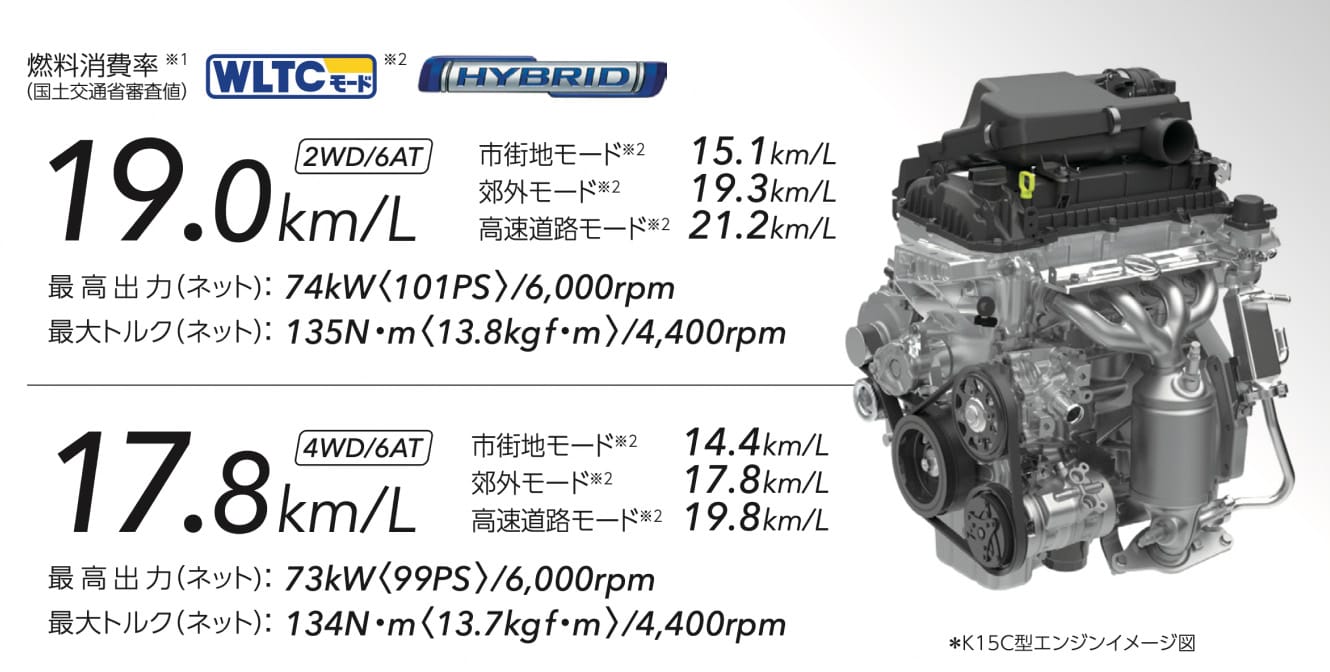 振動が少なく、静粛性にも優れています。マイルドハイブリッドの採用により低燃費に貢献するとともに、6速オートマチック(6AT)との組み合わせでスムーズかつスポーティーな走りを実現!
