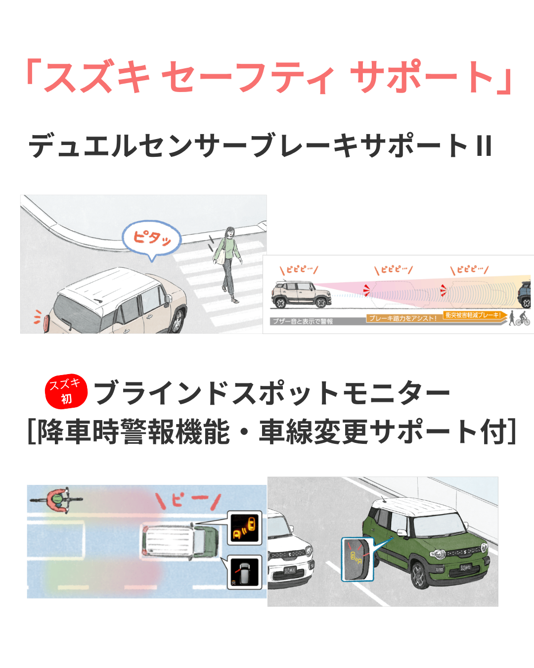 車線変更時の安全運転をサポートします。「降車時警報機能」はスズキ初の安全装備になっています。