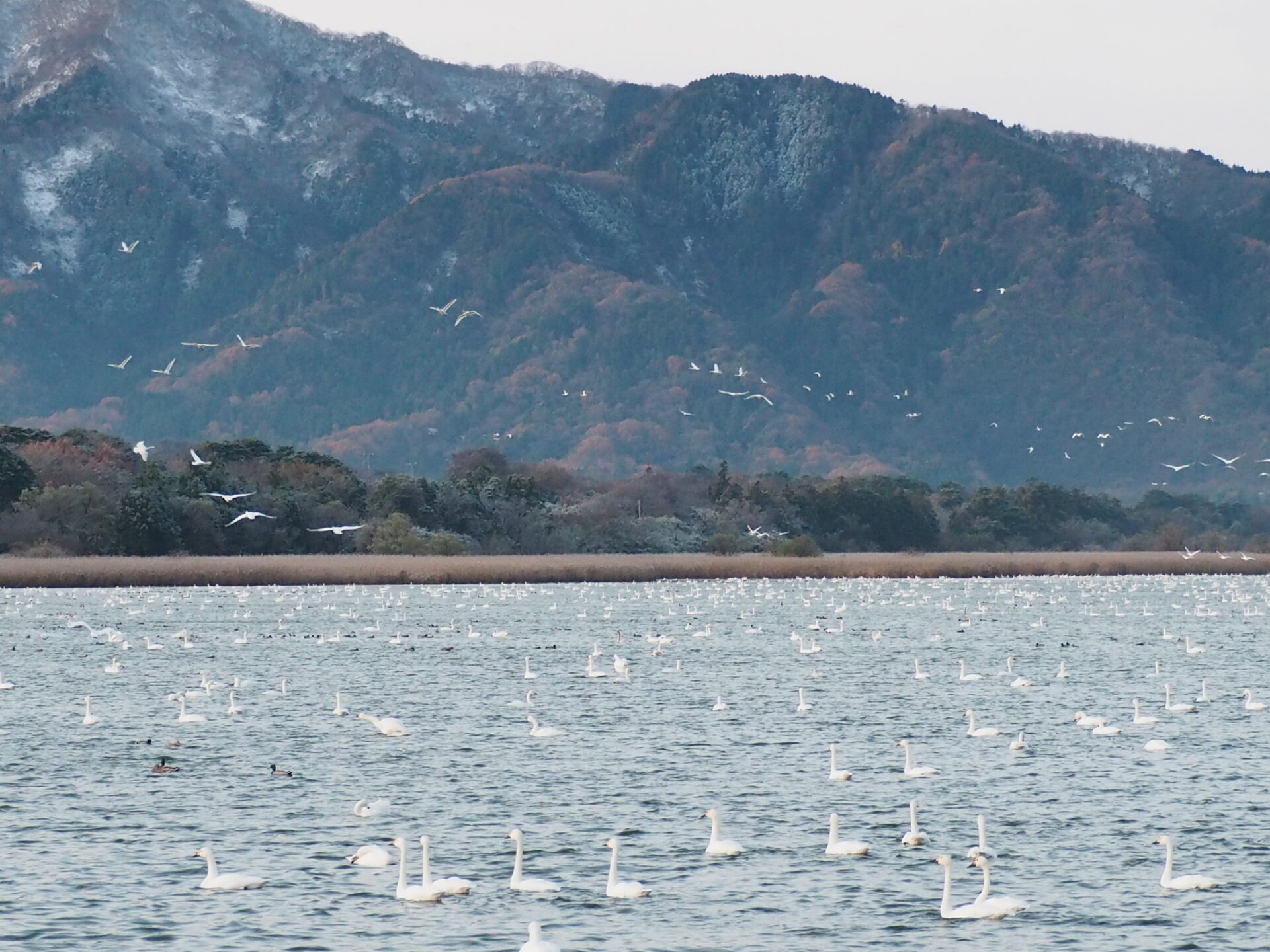 佐潟は国内最大の「砂丘湖」で、砂丘と砂丘の間のくぼ地に水がたまって出来た潟湖。白鳥は日中、周辺の田んぼへエサ取りに出かけ、夕方湖に戻って来ます。